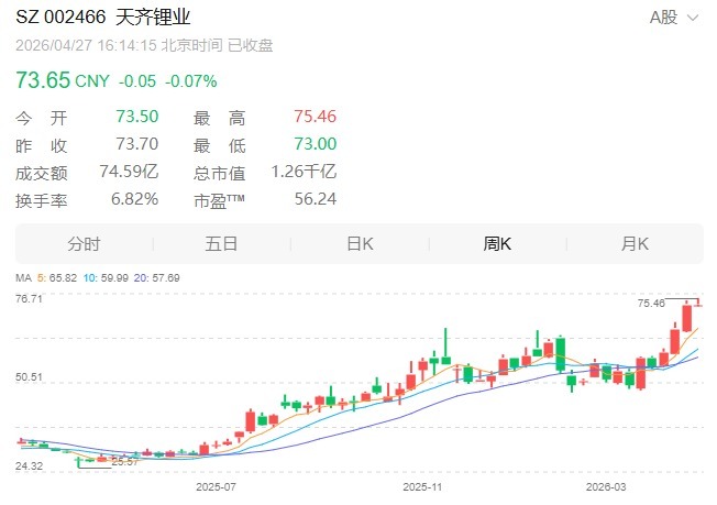 截至4月27日收盘,天齐锂业报73.65元/股,最新市值1257亿元。近一年来,公司股价上涨超过160%。