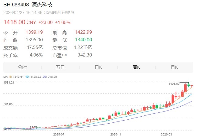截至4月27日收盘,源杰科技报1418元/股,最新市值1219亿元。近一年来,公司股价上涨超过1200%。