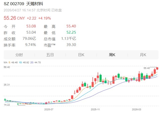 截至4月27日收盘,天赐材料报55.26元/股,最新市值1127亿元。近一年来,公司股价上涨超过220%。