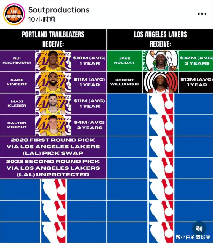 美媒建议湖人送出八村垒、文森特、克勒贝尔、克内克特、2028年首轮互换权、2032年不保护首轮从开拓者换来朱-霍勒迪与罗伯特-威廉姆斯。