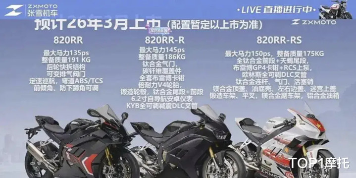 公告申报数据显示,张雪820RR搭载819cc排量的三缸发动机,最大功率99kw,换算成马力就是134.6匹,这个水平已经很接近MV奥古斯塔的800三缸了,作为一台国产发动机足以自傲了。根据之前张雪公布的三个版本,很显然这是最基本的RR版,RR-R版本可以达到145匹,最强的RR-RS版本才是150匹。