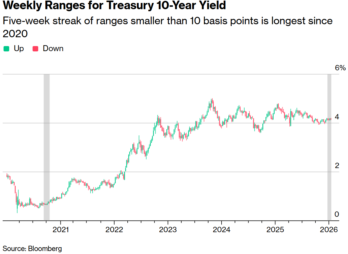 蒙特利尔银行资本市场利率策略师伊恩·林根在报告中观察到,自12月中旬以来,10年期美债收益率徘徊在 4.1% 至 4.2% 之间。这一区间经受住了包括12月就业数据、美国司法部针对美联储主席鲍威尔的行动,以及美国可能对伊朗采取军事行动预期在内的各种风险事件的考验。