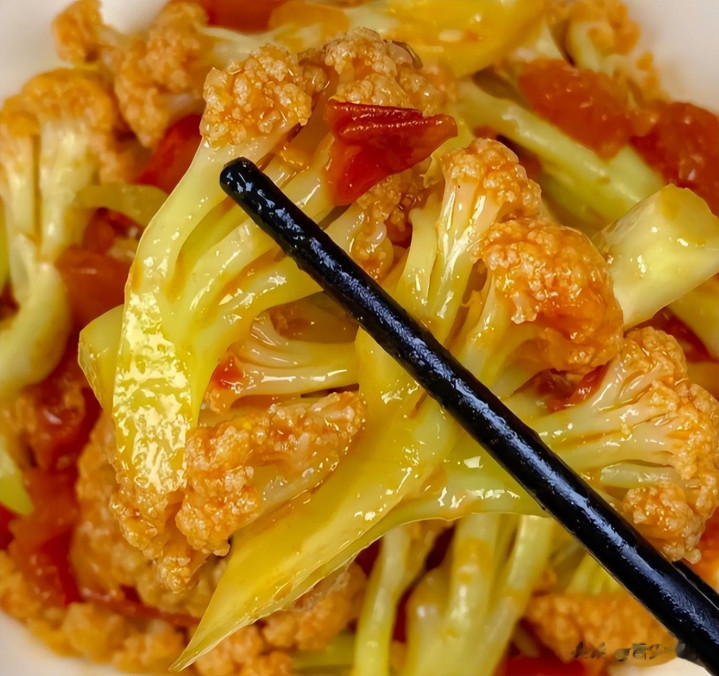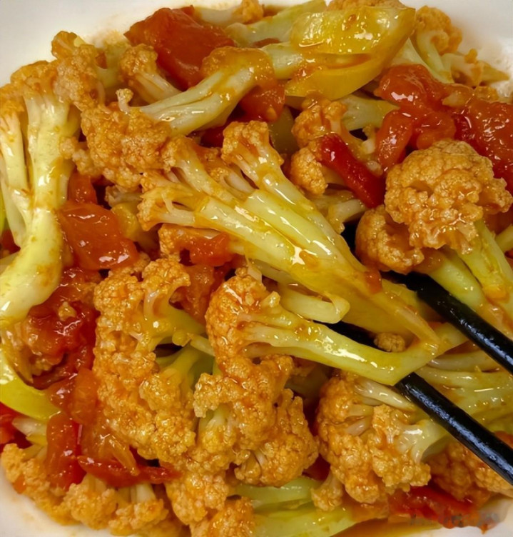 7. 翻炒几分钟,让花菜充分吸收番茄的味道,即可出锅装盘。